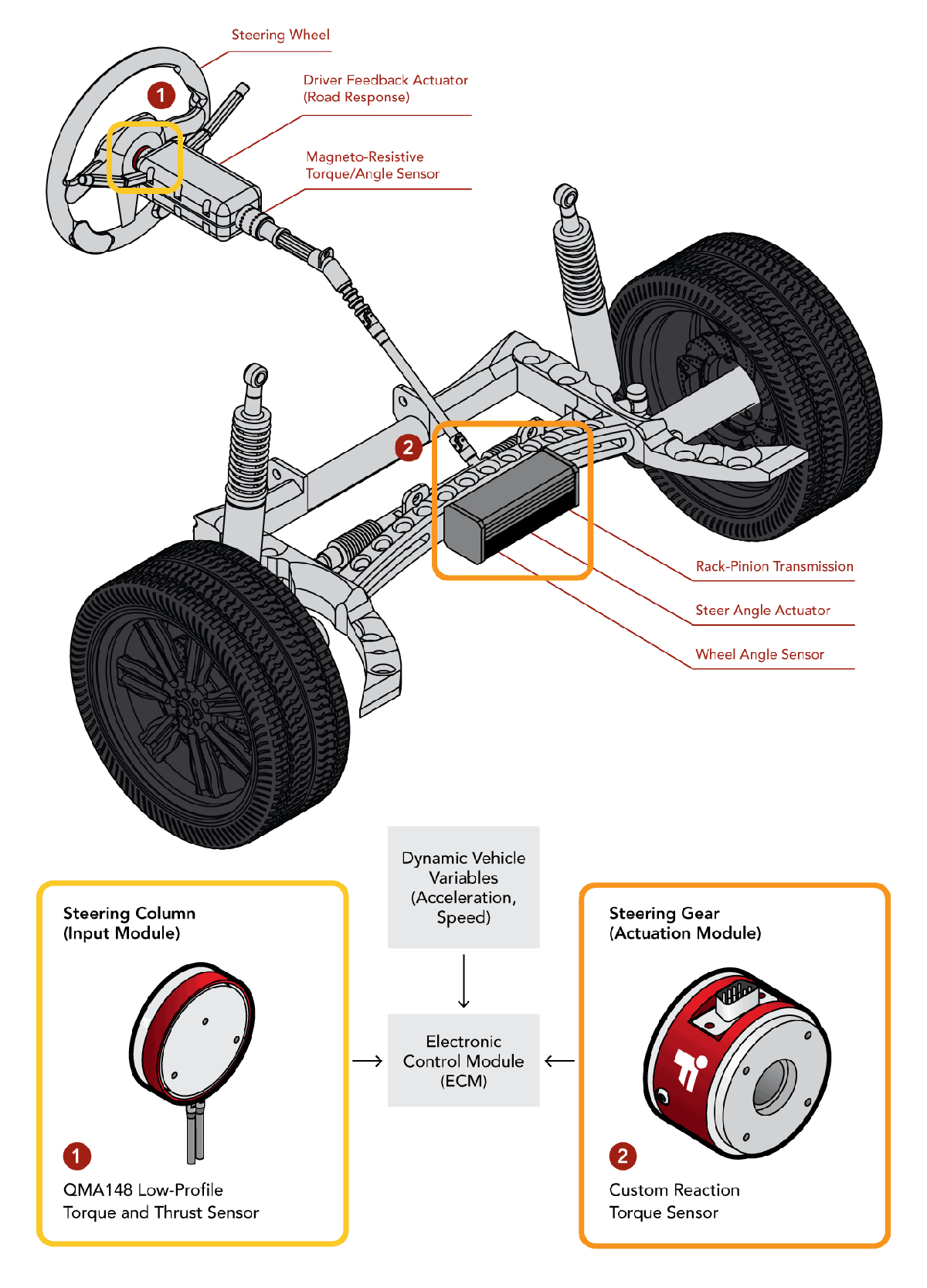传统上,公路和越野汽车车辆使用液压机械系统进行转向,机械系统通常由与方向盘物理连接的齿条和小齿轮转向器组成。在80年代和90年代,动力转向变得流行,并有助于减少转动方向盘所需的力。这是通过液压执行器实现的,该液压执行器有助于转动齿轮齿条转向器,即使使用电动助力转向,最大的挑战也是机械部件的局限性。在汽车行业中,线控转向(SbW)或线控(DbW)技术是使用电子设备,执行器和算法来取代手动方向盘与道路之间的液压和机械连接,该技术用电子控制系统取代了传统的机械控制系统,这一概念与航空工业中广泛使用的电传操纵系统非常相似。转向扭矩传感器如何在SbW系统中使用?多轴和反作用扭矩传感器经常用于线控转向测试环境,以验证控制系统设计。在验证和确认阶段,扭矩传感器和多轴传感器安装在方向盘(输入模块)和齿轮齿条传动(驱动模块)中,以审核和校准线控转向控制系统(控制回路参数,执行器动态)。线控转向系统必须在产品设计阶段进行验证,并且在部署到商业最终产品之前需要进行极端审核。汽车设计工程师可以利用乐鱼网页版的高精度多轴扭矩传感器来审核和验证线控转向系统的新设计,并校准反馈控制系统。