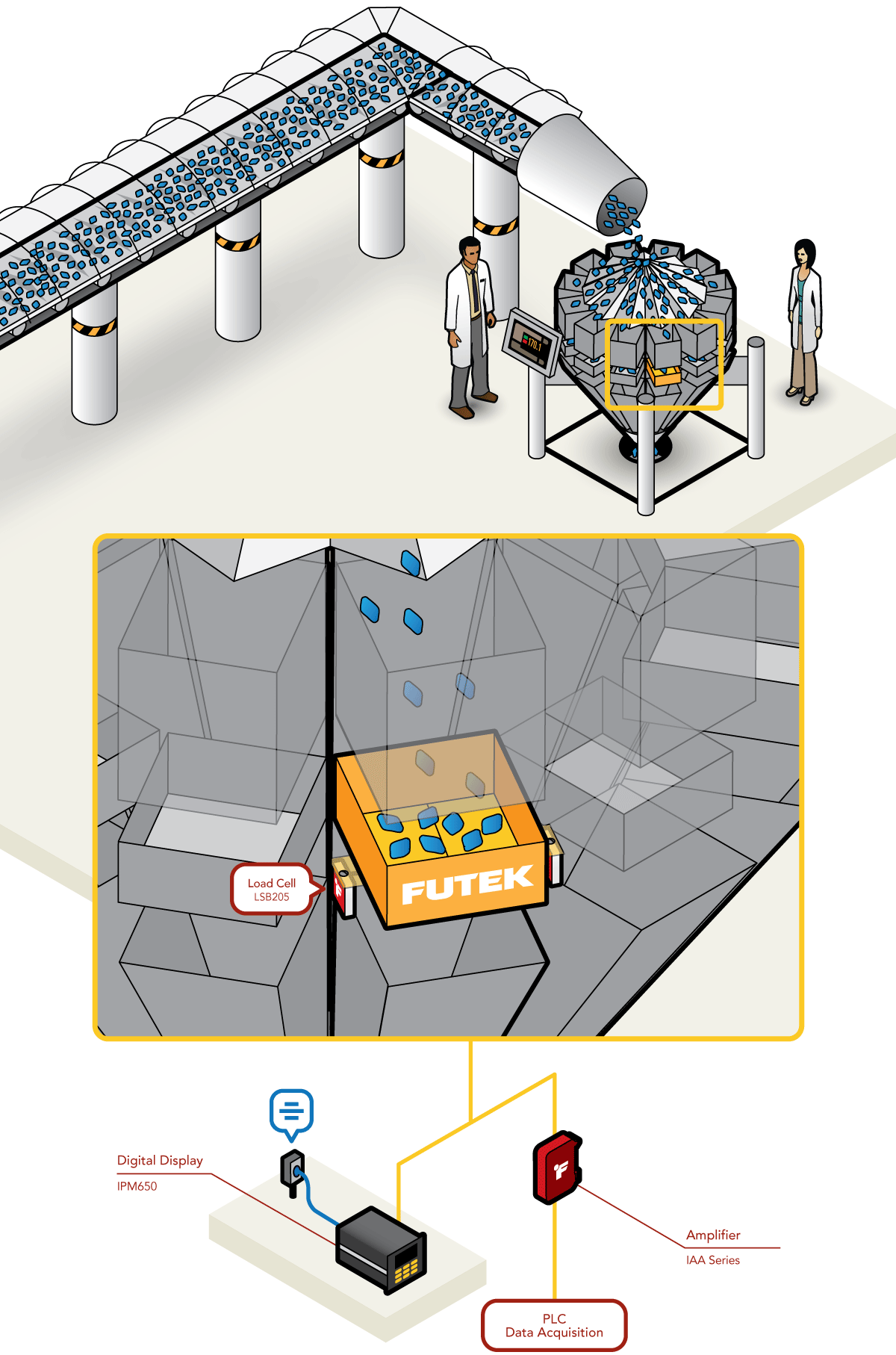 3、在该应用中,每个分配器上安装两只乐鱼网页版 LSB200微型力传感器,LSB200(带10倍于量程的过载保护)称量分配器中产品的数量。