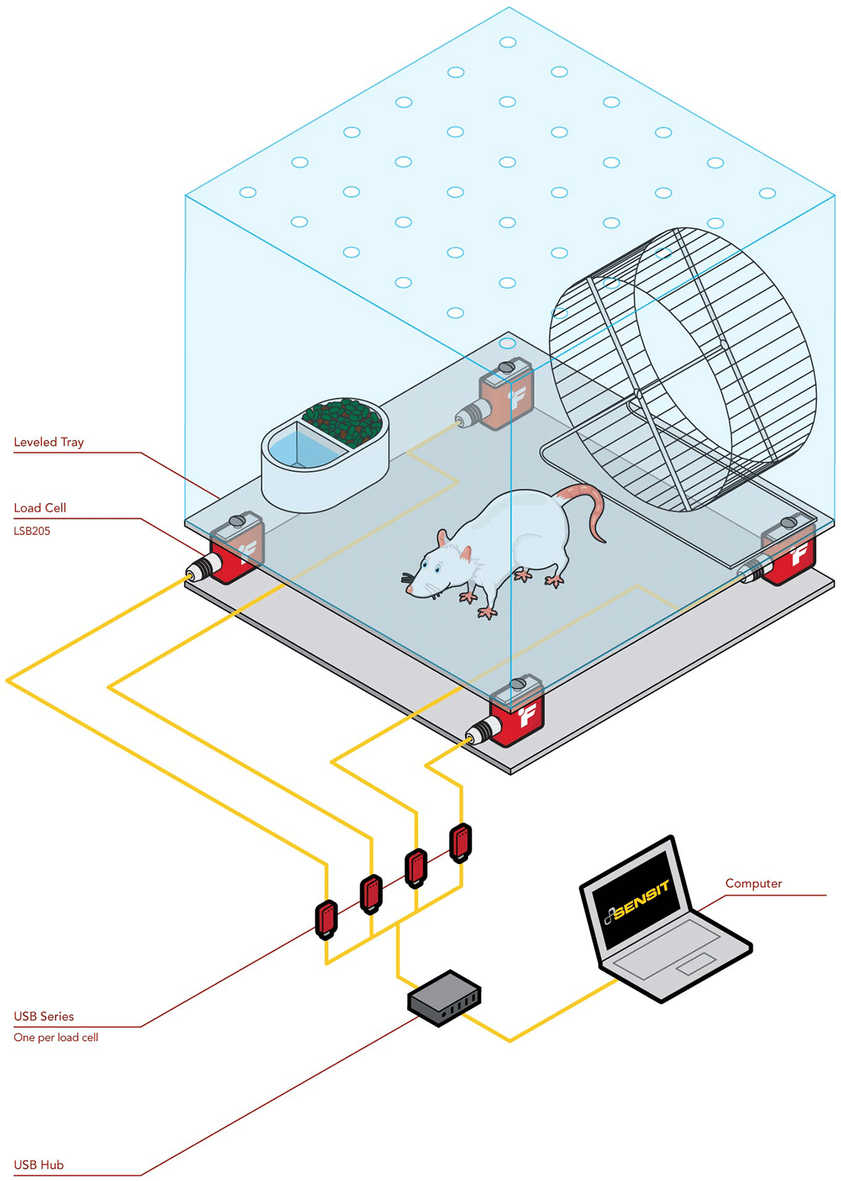 2、当白鼠在笼子里走动时,LSB200传感器将测量的力信号输出到各自的USB采集模块上。