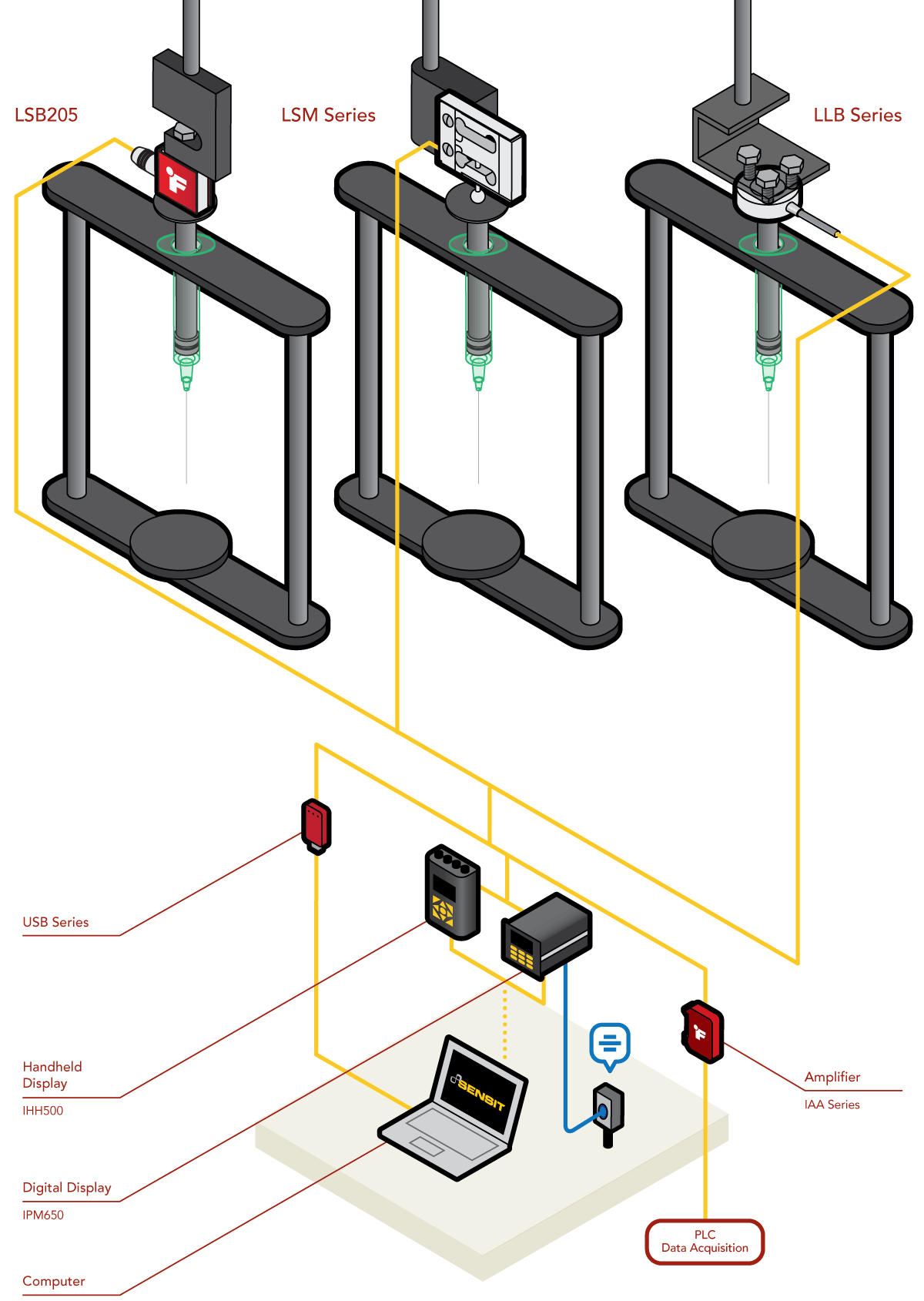 一只S型测力传感器(LSB200),平衡梁式力传感器(LSM系列),或者按钮型力传感器(LLB系列),及相之配套的仪器仪表(IAA系列, IPM650, IHH500, USB采集模块)和SENSIT采集软件。