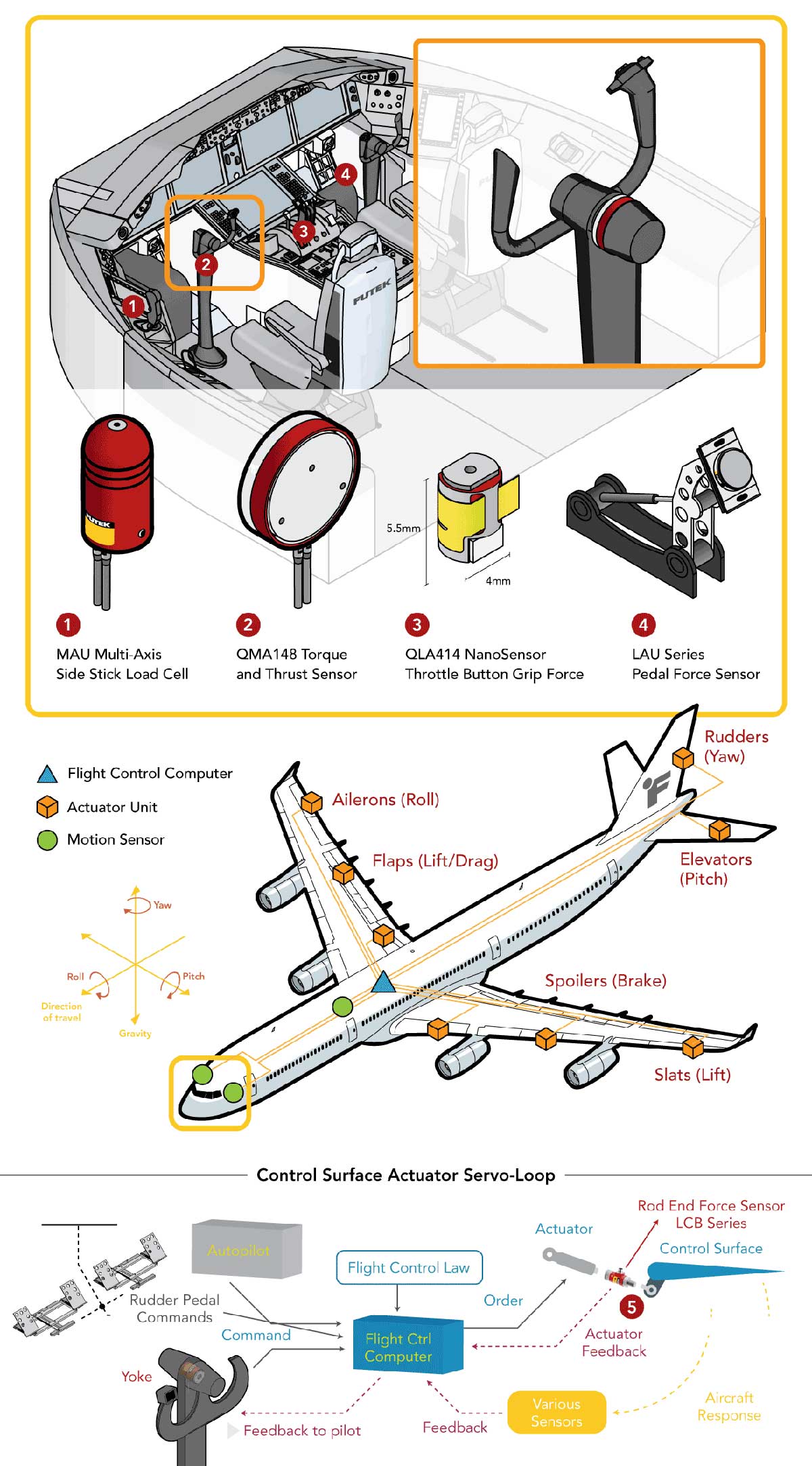 2、轭架:飞行员严重依赖控制柱(轭)来引导飞机的俯仰和滚动,通过旋转轭架,飞行员在滚动轴上机动。通过向前和向后推动轭,飞行员可以调整仰角和俯仰轴。为了确保控制柱正常运行,飞行控制工程师可以安装乐鱼网页版的MBA500扭矩和推力双轴传感器,以测量施加在轭架飞行控制上的力和扭矩。MBA500 多轴力传感器在 Mz(滚动)和 Fz(俯仰)方向上执行测量。
