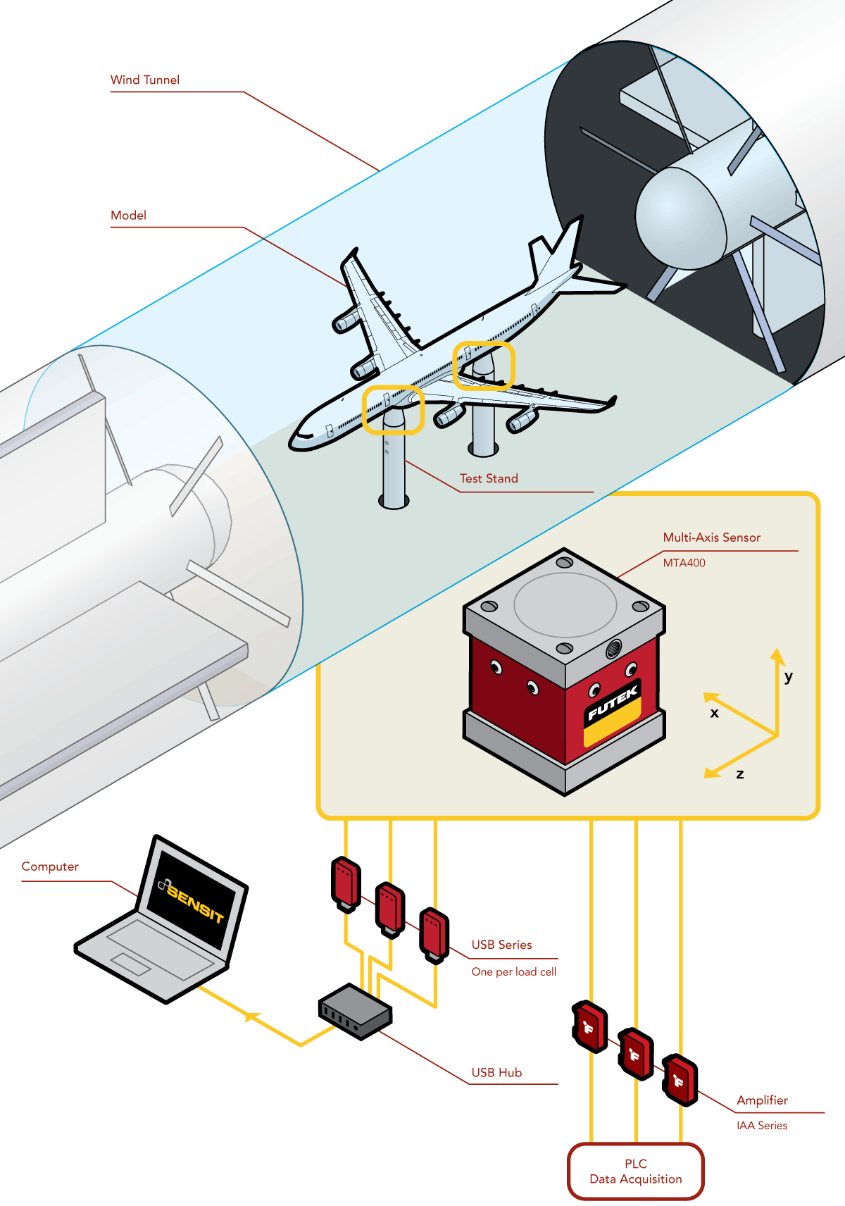 2、MTA400 固定在测试台上,以量化施加在模型上的力,然后将模型固定在三轴力传感器上,该元件将根据风洞的情况记录精确的压力。